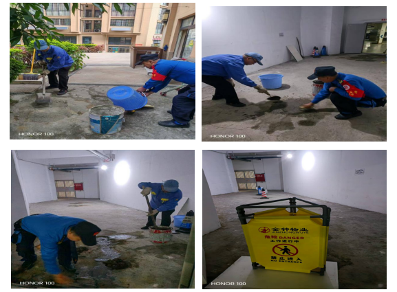 来源:龙发时代天街物业服务中心 近日,龙发时代天街安防秦师傅在例行巡查时,发现2号楼2单元负二层通往商业区的通道地面出现多处坑洼,存在安全隐患,影响业主的正常出行。 发现情况后,秦师傅第一时间上报物业中心。物业高度重视,迅速组织人员制定修补计划。工程部董师傅随即准备好水泥和沙子装桶备用,同时携带专业工具到施工现场与秦师傅协同作业,对路面坑洼处逐一进行细致填补。 为保障修补效果,避免新补路面被过早踩踏,施工人员还特意在修补区域铺设木板、放置锥桶、围挡,并张贴温馨提示,提醒业主注意行走安全。 经过及时修复,通道现已恢复平整通畅。不少途经的业主对物业的快速响应和细致服务表示赞赏,称此举真正解决了大家的出行困扰,是一件实实在在的“贴心事”。