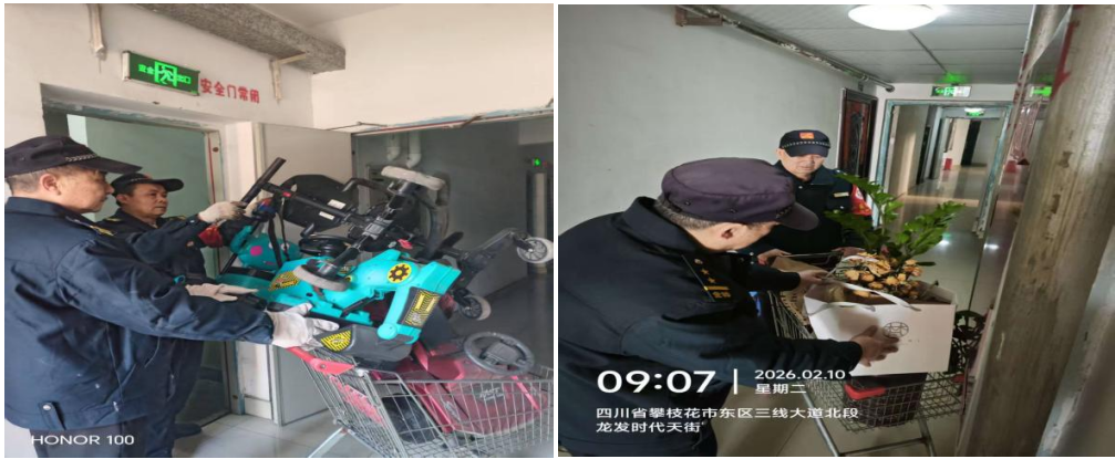 来源:龙发时代物业服务中心 为切实加强小区消防安全管理,有效消除消防通道堵塞隐患,保障业主生命财产安全,2026年2月10日,龙发时代天街住宅小区物业中心,组织前台客服、秩序维护部等6名工作人员,集中开展节前消防通道专项清理整治行动,全力打通小区“生命通道”,为业主平安过节筑牢安全屏障。 行动前期,物业中心提前谋划、广泛告知,通过业主微信群推送通知、单元公告栏张贴告示、上门一对一温馨提示等多种方式,明确杂物清理范围和要求,引导居民自行清理楼道、消防通道内堆放的杂物、非机动车、闲置家具等物品,耐心做好解释工作,积极争取广大业主的理解、支持与配合,为专项整治行动顺利推进奠定坚实基础。