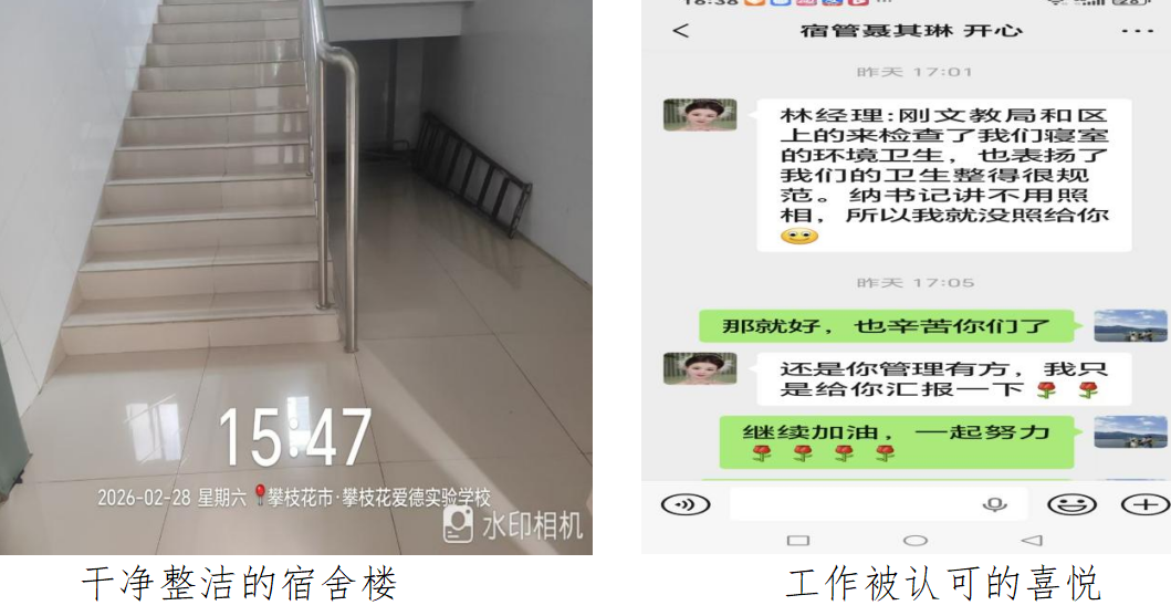 整整一周的日夜坚守与辛苦付出,换来了校园的干净整洁、宿舍楼的规范有序。3月2日,项目部员工兴奋地向我分享,我们的工作得到了区文教局及区级相关部门的肯定与表扬。宿管聂其琳第一时间分享喜讯:“刚文教局和区上的同志来检查寝室环境卫生,特意表扬我们的卫生整理得十分规范。”员工们言语间满是自豪与幸福感,那一刻,所有的辛苦付出都有了最好的回响,一切都值了。