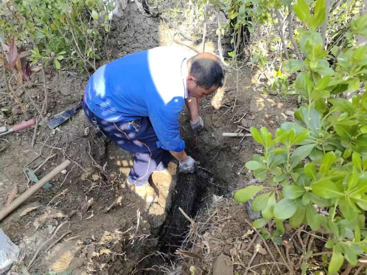 针对路面汪水问题,项目工程人员多次现场勘查、反复疏通,最终锁定问题根源:小区地下污水管道因使用年限较长,接口处出现细微破损,周边绿化树木的根系沿破损缝隙侵入管内,经过逐年生长形成密集根团,导致管道发生“肠梗阻”,不仅影响日常排污效率,还存在雨季污水倒灌的潜在风险。 为从根源上彻底解决该问题,项目何经理牵头制定专项施工方案,明确施工流程与责任分工,确保处置工作高效有序推进。施工过程中,工程团队严格按照方案分步落实:首先采用通杆逐段探查,精准锁定树根侵入位置与管道破损点位;随后开挖绿化带找到对应排水管,切开管道后,彻底清除管内密集根团及淤积的泥沙、污物,现场清理出的树根形成了长长的“树根长龙”;紧接着对管道破损接口进行密封修补,从源头杜绝树木根系再次侵入,延长地下管网使用寿命;最后开展通水测试与管道复查,确保排污系统稳定运行、隐患彻底清零。 施工期间,工程人员不畏脏累、高效作业,合理规划施工时段,最大限度降低施工对居民日常生活的影响。经过不懈努力,麓苑4栋前的路面已彻底摆脱汪水困扰,恢复干净整洁,居民出行也恢复了便捷与安全,得到了小区业主的一致好评与认可。