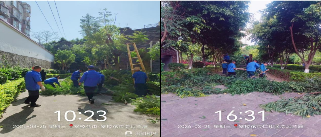 来源:浩远兰庭物业服务中心 金城巷作为浩远兰庭与宝岛花园的支路,因浩远兰庭小区内树木枝干茂密、伸出墙外,已严重影响支路车辆通行与行人安全。为切实解决这一问题,浩远兰庭全体员工化身春日里的“树医生”,开展树木修剪专项作业,为城市绿意“修枝焕新”,用实际行动守护辖区通行安全与生态环境。 2026年3月25日,阳光明媚,一群身着蓝色工装、头戴安全帽的员工忙碌在小区围墙边,有条不紊地开展修剪作业。他们登上高梯,小心翼翼靠近树冠,手中工具利落精准,逐一修剪过于茂密、遮挡光线及可能影响电力线路的枝干。地面上,刚剪下的枝叶堆起,新鲜的草木气息在春日里格外清新。