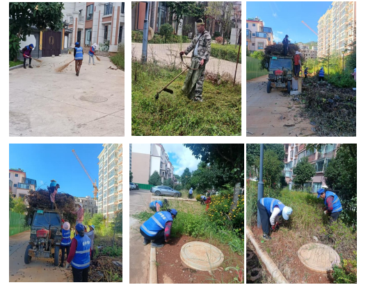 四、公共环境维护、绿化 针对小区环境进行整改,按照服务要求,保洁人员每天对小区的公共部位进行清扫,打扫楼道卫生、清运垃圾,绿化人员修剪树枝、营造干净整洁的小区环境,每日疫情常态化工作,环境维护部人员对公共设施重点部位进行消杀。