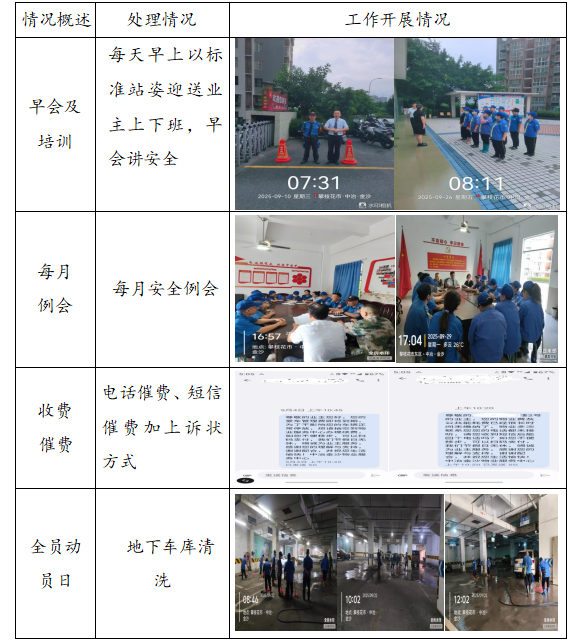 尊敬的小区业主/使用人: 您们好! 为营造和谐、友善、关爱的氛围,为业主搭建互通的平台,金钟物业为您服务是我们永恒的主题。中冶金沙物业服务全体员工用心工作,希望通过物业的努力,让您们生活得更舒适,工作也开心愉快,为此我们将2025年9月份的物业日常工作开展呈现于您,便于您们业主全面了解小区的情况和物业所开展的工作。 一、客户中心工作 持续围绕“金钟金令”项目要求员工保持干净整洁的外表及精神抖擞的工作状态,严格做到服务中心牵头工作。