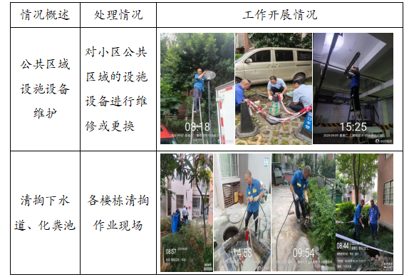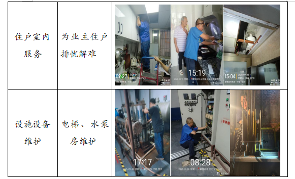 二、工程维修、养护 物业服务中心加强设施设备的巡视,对空调排水管、垃圾集中站、公共照明、消防设施、道路、周界围墙、小区雨污水井、化粪池、沟渠等进行排查、维修、养护、巡视及安全防范措施,发现存在的问题并及时解决处理。