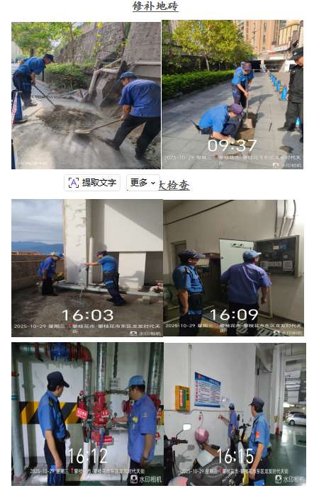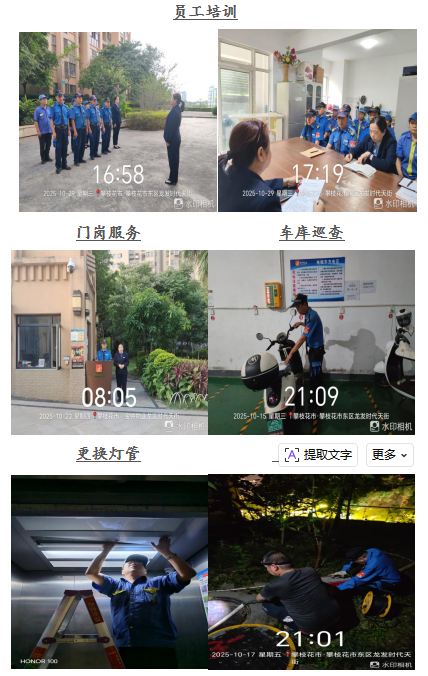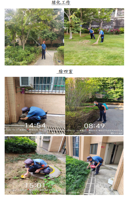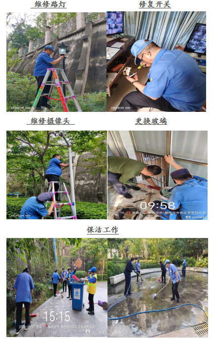 尊敬的龙发•时代天街业主: 您们好! 金秋十月,翩然而至。龙发.时代天街服务中心全体员工感谢大家一直以来对物业工作支持和配合,物业将用心服务,努力工作,为您提供优质的服务。在此,谨将2025年10月的主要工作呈现于你们,以便你们能全面了解物业的工作内容和情况,并敬请你们提出宝贵意见和建议。谢谢! 一、客服部: 1、本月客服日常接待 136/次,就物业服务的相关事 宜与业主交流148余次,及时协调处理业主提出的问题。 2、张贴资料及各类温馨提示:张贴《关于清理小区杂物的温馨提示》等资料5份。 3、正确引导业主及装修施工人员依法依规进行住宅装修管理活动,做好日常装修巡检,规范小区装修。 4、积极与业主沟通交流,化解业主矛盾1起,引导业主主动缴费。 二、工程维护部: 1、本月电梯维保4次,消防月检1次,处理烟感器报警11次,上门服务7次,更换、修复照明9盏,修理门禁4次,清掏窨井8个,全面消杀2次,每天设施设备巡检,发现隐患及时整改,确保设备正常的运行。 2、修补地下车库出口破损地砖8块,方便业主出行。 3、面对夜间突发的返水问题,积极疏通主管道,确保业主拥有卫生、安全的居住环境。 三、环境维护部: 1、积极进行小区环境保洁工作,清理楼道、车库、屋顶杂物、清扫电梯间、门厅、消防通道废弃物,清洗垃圾桶250余只,营造干净、整洁的小区环境。 2、对小区的枯枝枯叶及时清理,保证业主安全出行。 3、在小区的毒饵盒、地洞投放鼠药,喷撒灭蚊药剂,抛洒雄黄粉,将“除四害”工作落到实处。 四、秩序维护部: 1、加强门岗管理,按照相关规定加强重点部位巡逻,密切监控电梯及小区的日常情况,充分发挥“千里眼”的作用。 2、对消火栓、灭火器全面检查,确保正常使用。 3、清理违规停放车辆1辆,保证消防通道畅通、有序。 若有紧急情况,请拨打物业服务24小时值班电话: 18982372927,5714731。 五、各项工作图片展示: