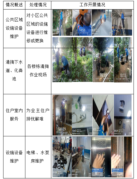 二、工程维修、养护 物业服务中心加强设施设备的巡视,对空调排水管、垃圾集中站、公共照明、消防设施、道路、周界围墙、小区雨污水井、化粪池、沟渠等进行排查、维修、养护、巡视及安全防范措施,发现存在的问题并及时解决处理。