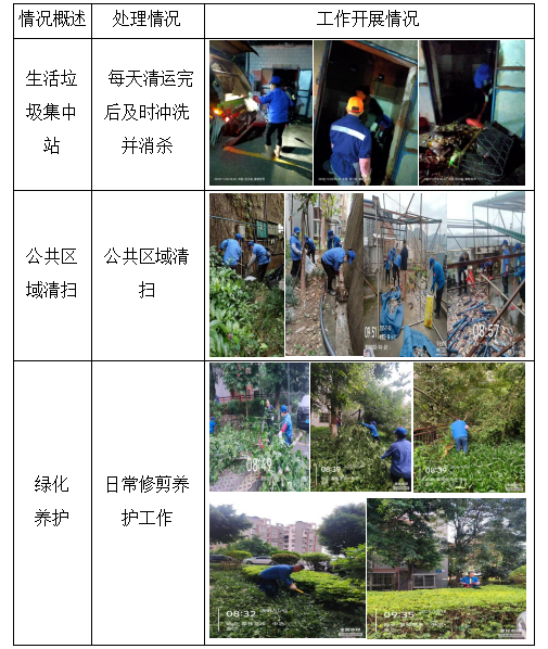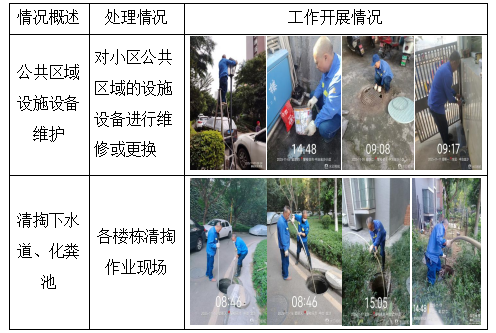 物业服务中心加强设施设备的巡视,对空调排水管、垃圾集中站、公共照明、消防设施、道路、周界围墙、小区雨污水井、化粪池、沟渠等进行排查、维修、养护、巡视及安全防范措施,发现存在的问题并及时解决处理。