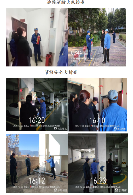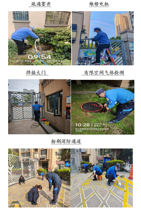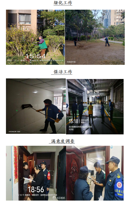 尊敬的龙发•时代天街业主: 你们好! 寒冬腊月,岁末将至,四序更替中我们共享喜乐、安宁。龙发.时代天街服务中心全体员工感谢大家一直以来对物业工作支持和配合,物业将用心服务,努力工作,为您提供优质的服务。在此,谨将2025年12月的主要工作呈现于你们,以便你们能全面了解物业的工作内容和情况,并敬请你们提出宝贵意见和建议。谢谢! 一、 客服部: 1、本月客服日常接待 236/次,就物业服务的相关事 宜与业主交流218余次,及时协调处理业主提出的问题。 2、张贴资料及各类温馨提示:张贴《治安管理处罚法关于养犬行为的规定》、国家宪法日、公民节约用水行为规范、喝酒不开车宣传画、《关于2026年元旦假期的温馨提示》等资料10份。 3、正确引导业主及装修施工人员依法依规进行住宅装修管理活动,做好日常装修巡检,规范小区装修,对违规搭建的业主开具违约整改书1份。 4、继续开展预存2026年物业费送礼品的活动,鼓励业主踊跃参加。 5、开展满意度调查活动,其中客户接待满意度99.73%,维修服务满意度99.46%,秩序维护满意度99.46%,环境维护满意度99.36%,总体满意度99.50%,收集业主意见6条。 6、接受东区消防大队检查,进一步压实物业消防安全责任,切实筑牢小区安全防线。 二、工程维护部: 1、本月电梯维保1次,消防月检1次,处理烟感器报警13次,上门服务5次,更换、修复照明20盏,修理门禁7次,清掏窨井8个,修理监控2次,每天设施设备巡检,发现隐患及时整改,确保设备正常的运行。 2、对大门口的消防通道重新粉刷。 3、大门电机模块返厂修复后重新安装,方便业主出行。 三、环境维护部: 1、积极进行小区环境保洁工作,清理楼道、车库、屋顶杂物、清扫电梯间、门厅、消防通道废弃物,清洗垃圾桶250余只,营造干净、整洁的小区环境。 2、对小区的卫生死角及时清扫,保证环境干净、整齐。 四、秩序维护部: 1、加强门岗管理,按照相关规定加强重点部位巡逻,密切监控电梯及小区的日常情况,充分发挥“千里眼”的作用。 2、清理违规停放车辆3辆,处理外来车辆占用业主车位事件1起,保证通道畅通、有序。 3、开展节前安全大排查,查出隐患1起,已整改。 若有紧急情况,请拨打物业服务24小时值班电话: 18982372927,5714731。 五、各项工作图片展示: