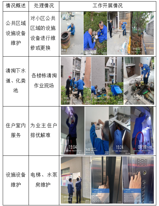 二、工程维修、养护 物业服务中心加强设施设备的巡视,对空调排水管、垃圾集中站、公共照明、消防设施、道路、周界围墙、小区雨污水井、化粪池、沟渠等进行排查、维修、养护、巡视及安全防范措施,发现存在的问题并及时解决处理。