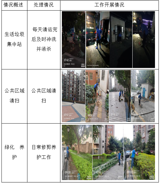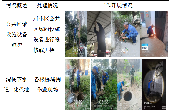 二、工程维修、养护 物业服务中心加强设施设备的巡视,对空调排水管、垃圾集中站、公共照明、消防设施、道路、周界围墙、小区雨污水井、化粪池、沟渠等进行排查、维修、养护、巡视及安全防范措施,发现存在的问题并及时解决处理。