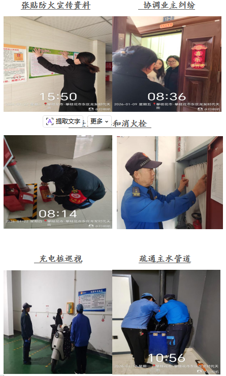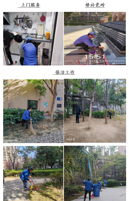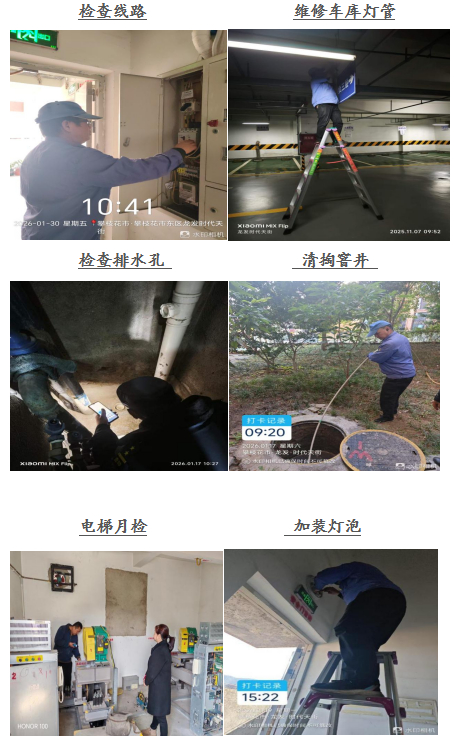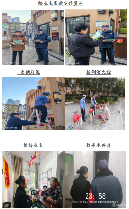 尊敬的龙发﹒时代天街业主: 你们好! 一元复始,旭日初升,愿我们以热忱开启新征程。龙发.时代天街服务中心全体员工感谢大家一直以来对物业工作支持和配合,物业将用心服务,努力工作,为您提供优质的服务。在此,谨将2026年1月的主要工作呈现于你们,以便你们能全面了解物业的工作内容和情况,并敬请你们提出宝贵意见和建议。谢谢! 一、 客服部: 1、本月客服日常接待 189/次,就物业服务的相关事 宜与业主交流175余次,及时协调处理业主提出的问题。 2、张贴资料及各类温馨提示:更新桁架一副,张贴《关于支付物业费的温馨提示》、《四川省人民政府2026年森林防火命令》、《攀枝花市人民政府2026年森林草原防火命令》、《绷紧防火弦,共守平安线》等资料15份。 3、正确引导业主及装修施工人员依法依规进行住宅装修管理活动,做好日常装修巡检,规范小区装修。 4、开展2026年森林防火宣传工作,向业主发放宣传画,楼栋显眼处张贴防火令。 二、工程维护部: 1、本月电梯维保1次,消防月检1次,处理烟感器报警11次,上门服务7次,更换、修复照明9盏,修理门禁6次,清掏窨井8个,修理监控1次,每天设施设备巡检,发现隐患及时整改,确保设备正常的运行。 2、对小区加压泵的个别零件进行更换,保证高区供水。 三、环境维护部: 1、积极进行小区环境保洁工作,清理楼道、车库、屋顶杂物、清扫电梯间、门厅、消防通道废弃物,清洗垃圾桶250余只,营造干净、整洁的小区环境。 2、对小区的卫生死角及时清扫,保证环境干净、整齐。 四、秩序维护部: 1、加强门岗管理,按照相关规定加强重点部位巡逻,监控电梯及小区的日常情况,充分发挥“千里眼”的作用。 2、清理违规停放车辆1辆,保证车库停车有序。 若有紧急情况,请拨打物业服务24小时值班电话: 18982372927,5714731。 五、各项工作图片展示: