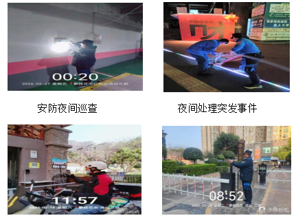 2、秩序维护:严格落实24小时安防巡逻制度,加强出入口管控与车辆管理。门岗登记进出人员568人次;临时车辆管理308辆;发放温馨提示、快递扫码登记、劝阻违规停车37次,每日按时完成重点部位巡查,每月消防设施设备排查等工作的完成,确保小区无安全、治安事故的发生。