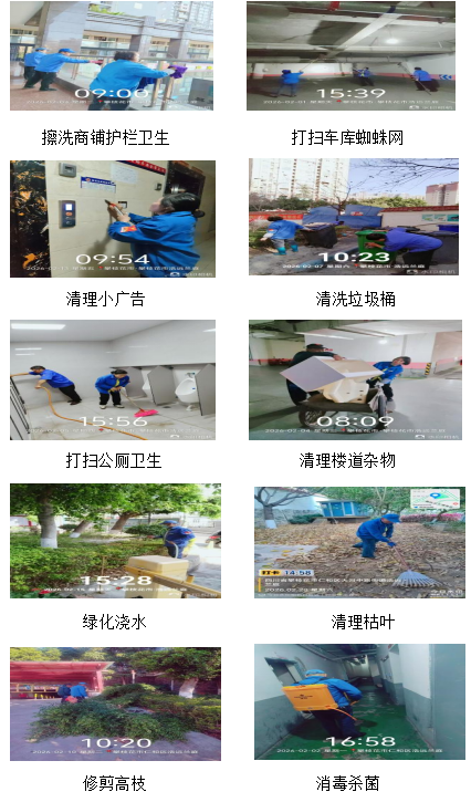 3、环境保洁与绿化:执行分级分区保洁标准,公共区域清洁度得到有效保障,完成生活垃圾日产日清。清理楼道杂物、打扫蜘蛛网、清理小广告、清洗垃圾桶共17次,绿化清理枯枝枯叶9次;绿化修枝造型1次;绿化补种、除草、施肥、浇水消杀合计7次;清理绿化带内白色垃圾20次。保洁与绿化员工的辛苦,换来了小区优美的环境,清晰的空气,舒适的居住环境。